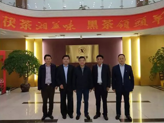 湖南省副省長(cháng)陳飛(右三)、益陽(yáng)市副市長(cháng)毛知兵(左一)、赫山區委副書(shū)記、區長(cháng)馬文才(右一)、益陽(yáng)茶廠(chǎng)有限公司董事長(cháng)彭雄根(右二)、總經(jīng)理陳小春(左二)合影