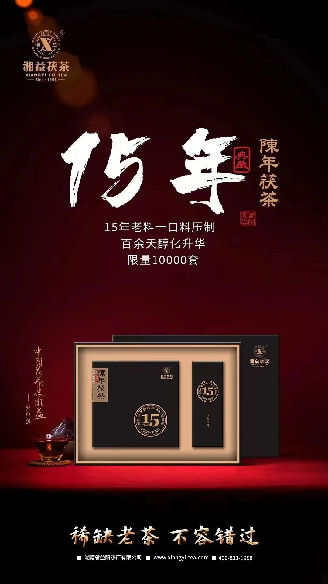 因其原料的稀缺,加之采用一口料制作,?陳年茯茶?限量發(fā)售10000套。每套均有獨立編號和典藏證書(shū),并有劉杏益大師的親筆簽名。當下品飲,即可享受15年時(shí)光釀就的陳醇好味;投資收藏,保值升值空間十分巨大,未來(lái)可期。